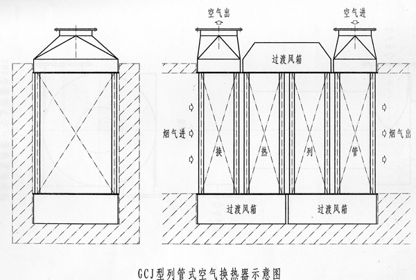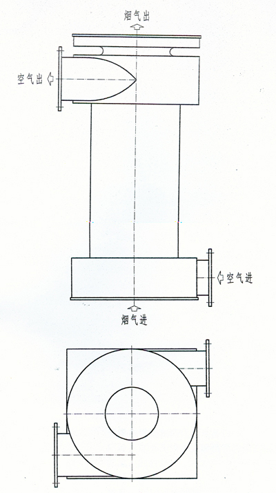 GCJ型列管式空气换热器结构紧凑,水平、垂直烟道均能适用。该换热器传热面由管束组成,烟气(热源)在管外流动,助燃空气在管内流动。在换热管内加入麻花插件,用来改变空气传热面上流体的附面层,增加流动介质的紊流强度,增强空气侧的对流给热,从而提高了换热器的传热效率。由于列管式空气换热器所需的制作材料钢管和钢板市场供应充足,制作、安装工艺简单,不易漏气,不积灰等优点,因此在国内外得到普遍推广使用。